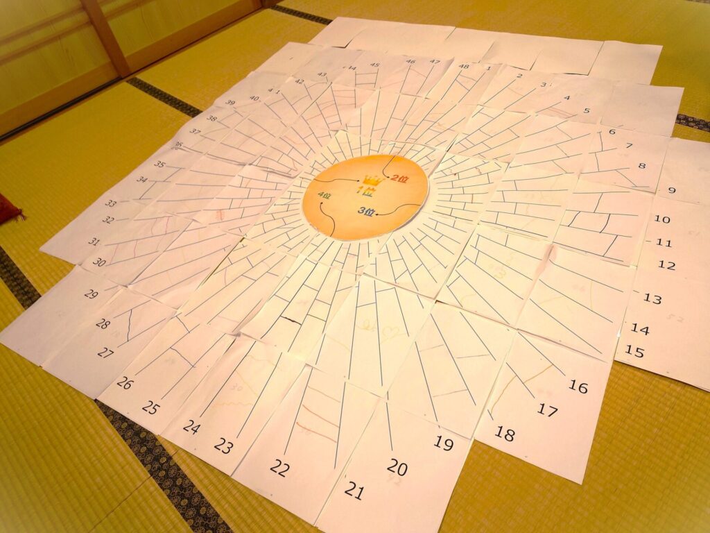上の画像をご覧ください。これは参加された皆さんで完成させた巨大アミダくじです。約3m四方あり、48本の直線が中心から引かれています。