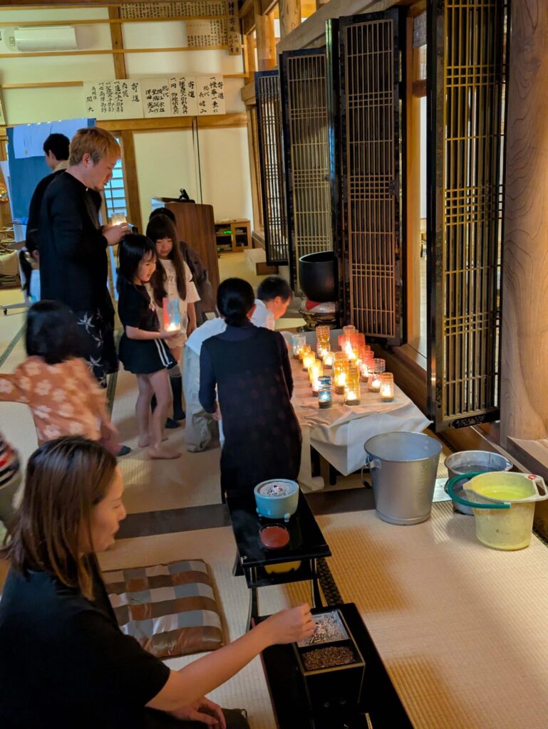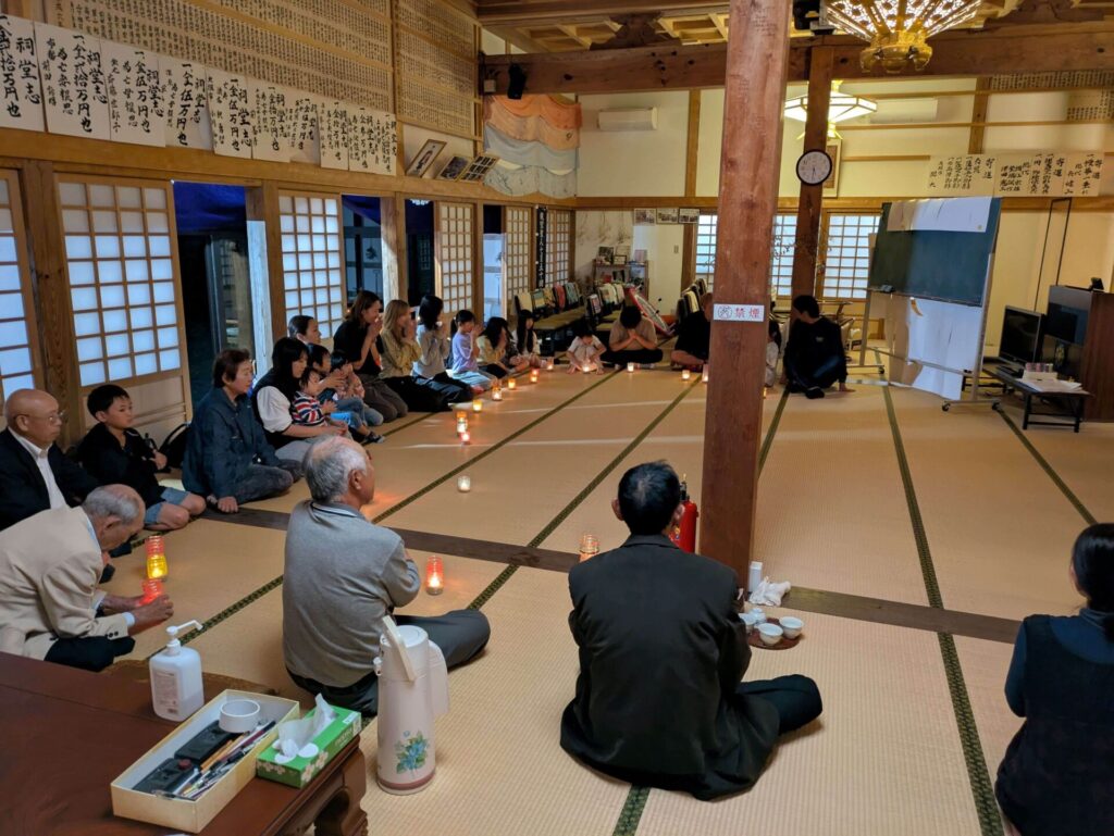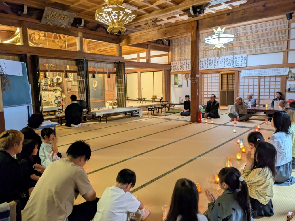 まずは、各々自由にペットボトルキャンドルを選び、御堂に進みます。御堂内が色とりどりのキャンドルでいっぱいになり、読経が始まります。すると、皆さまの掌が自然と合わさります。
