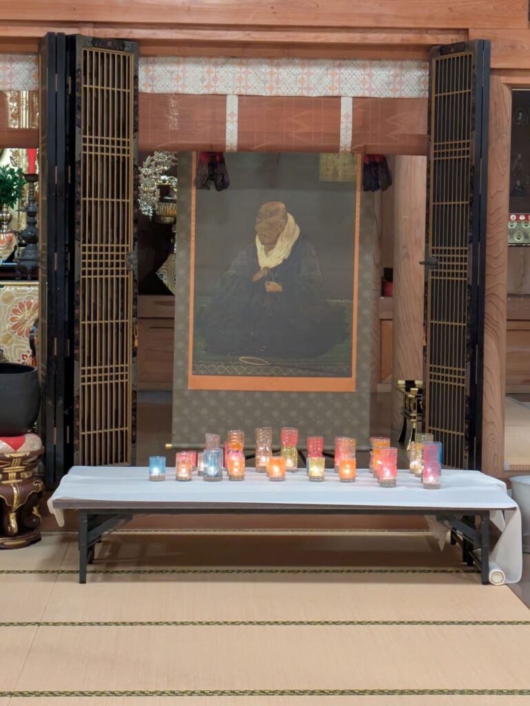 読経の後、親鸞聖人御影(絵像)の前に設えた献灯台にそれぞれのキャンドルをお供えし、お焼香をします。